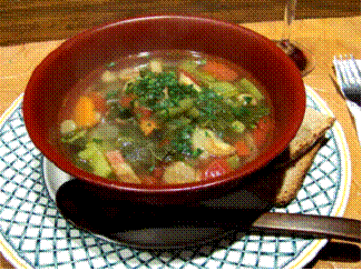 Use your favorite meat for flavoring. I used organic Andouillle from the Oak Grove Plantation at the green market and guanciale from Di Palo in Little Italy. Render fat in a heavy soup pot with butter along with a crushed garlic clove. Add bite-size chopped burdock root, carrot, onion, green beans, creamer potato and sauté more. Add water to cover the vegetables and cook with a bay leaf without covering until vegetables are almost done. Add chopped tomatoes, burdock greens and fresh garbanzo beans. Cook until the beans are done. Season with salt and serve hot. You may serve with freshly grated Parmegiano Reggiano if you like.