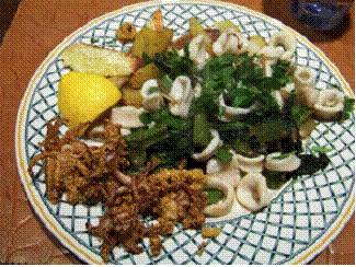 Sauté chopped burdock greens with garlic in olive oil until al dente. Add cleaned and chopped squid and finish up cooking. Cook squid for a minimum time so that you won’t make them rubbery. Season with salt and freshly ground pepper and serve immediately.